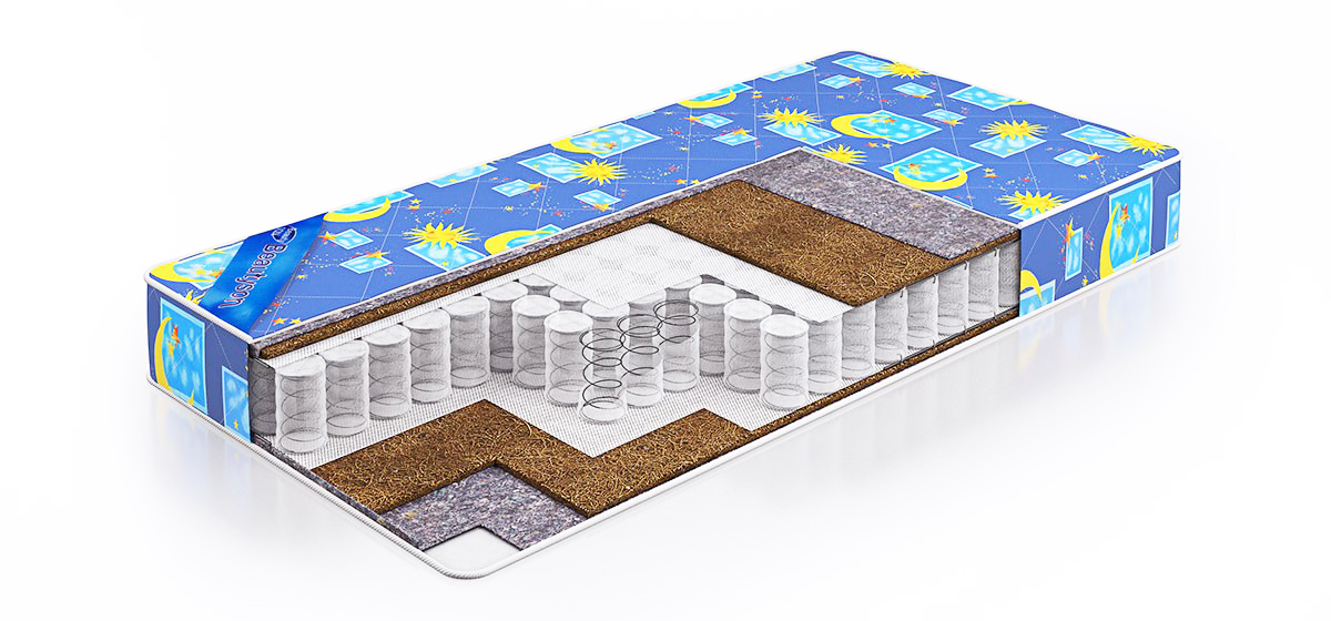 Основным наполнителем матраса является латексированная кокосовая койра. Данный материал придает матрасу жесткость и обеспечивает правильное развитие детского позвоночника. Кокосовая койра обладает рядом бактерицидных свойств, что предотвращает развитие вредных микроорганизмов внутри матраса и делает детское спальное место гигиеничным и гипоаллергенным.