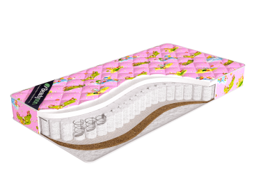 Матрас обладает разным уровнем жесткости сторон. Одна сторона выполнена из холлофайбера – легкого и упругого материала. Отличительным преимуществом холлофайбера является то, что он совершенно не впитывает влагу – это значительно облегчает просушку детского матраса в случае необходимости. Другая сторона выполнена из кокосовой койры – жесткого ортопедичного материала, обладающего бактерицидными свойствами. Все слои матраса отлично вентилируются, создавая оптимальный микроклимат изделия.