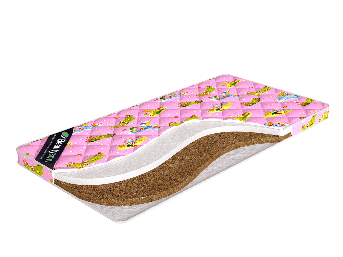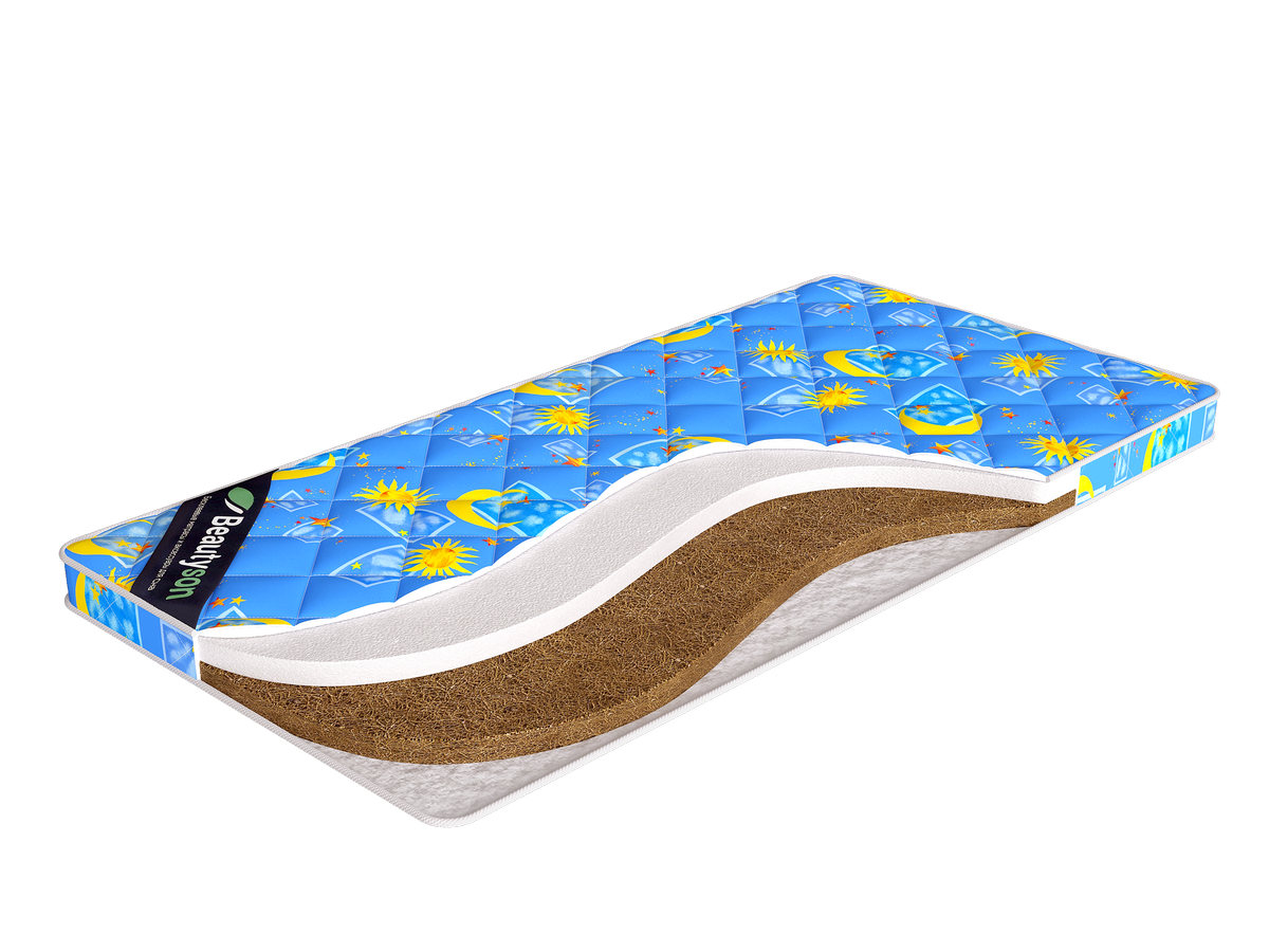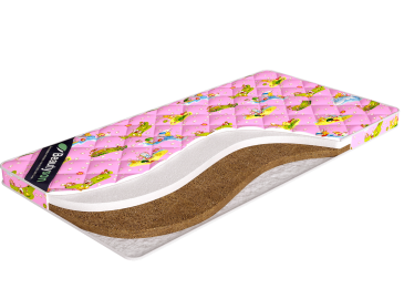 Матрас обладает разным уровнем жесткости сторон. Одна сторона выполнена из холлофайбера – легкого и упругого материала. Отличительным преимуществом холлофайбера является то, что он совершенно не впитывает влагу – это значительно облегчает просушку детского матраса в случае необходимости. Другая сторона выполнена из кокосовой койры – жесткого ортопедичного материала, обладающего бактерицидными свойствами. Все слои матраса отлично вентилируются, создавая оптимальный микроклимат изделия.
