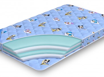 Наполнители уложены в яркий чехол из плотного поликоттона 4 слоями по 3 см каждый так, что с одной стороны сверху находится пенополиуретан, а с другой - струтто. В результате матрас имеет поверхности разной жёсткости: среднежёсткую для деток школьного возраста и жёсткую для дошкольников, чей позвоночник только формируется.