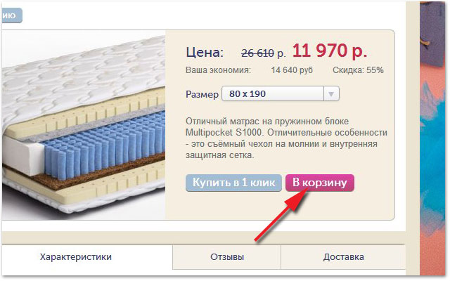 1. Для того, чтобы оформить заказ - выберите нужный размер матраса и нажмите кнопку "В корзину" на странице необходимого Вам товара.