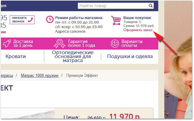 После того, как Вы нажали кнопку "В корзину" изменится состояние корзины и станет доступна ссылка "Оформить заказ".