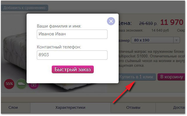 Также можно сделать заказ при помощи кнопки «Купить в 1 клик» - Вам нужно будет всего лишь указать свое имя и телефон. Мы позвоним Вам и оформим заказ по телефону.
