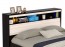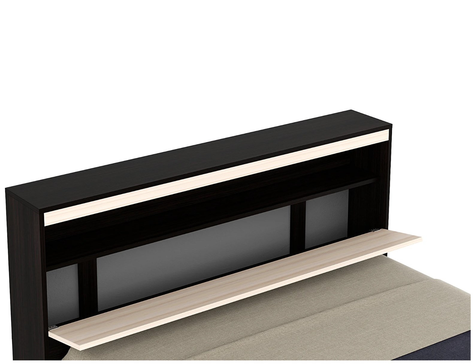 Изголовье выполнено в виде модуля для хранения белья. Откидная дверь за подушками скрывает вместительное пространство для хранения постельных или иных принадлежностей.