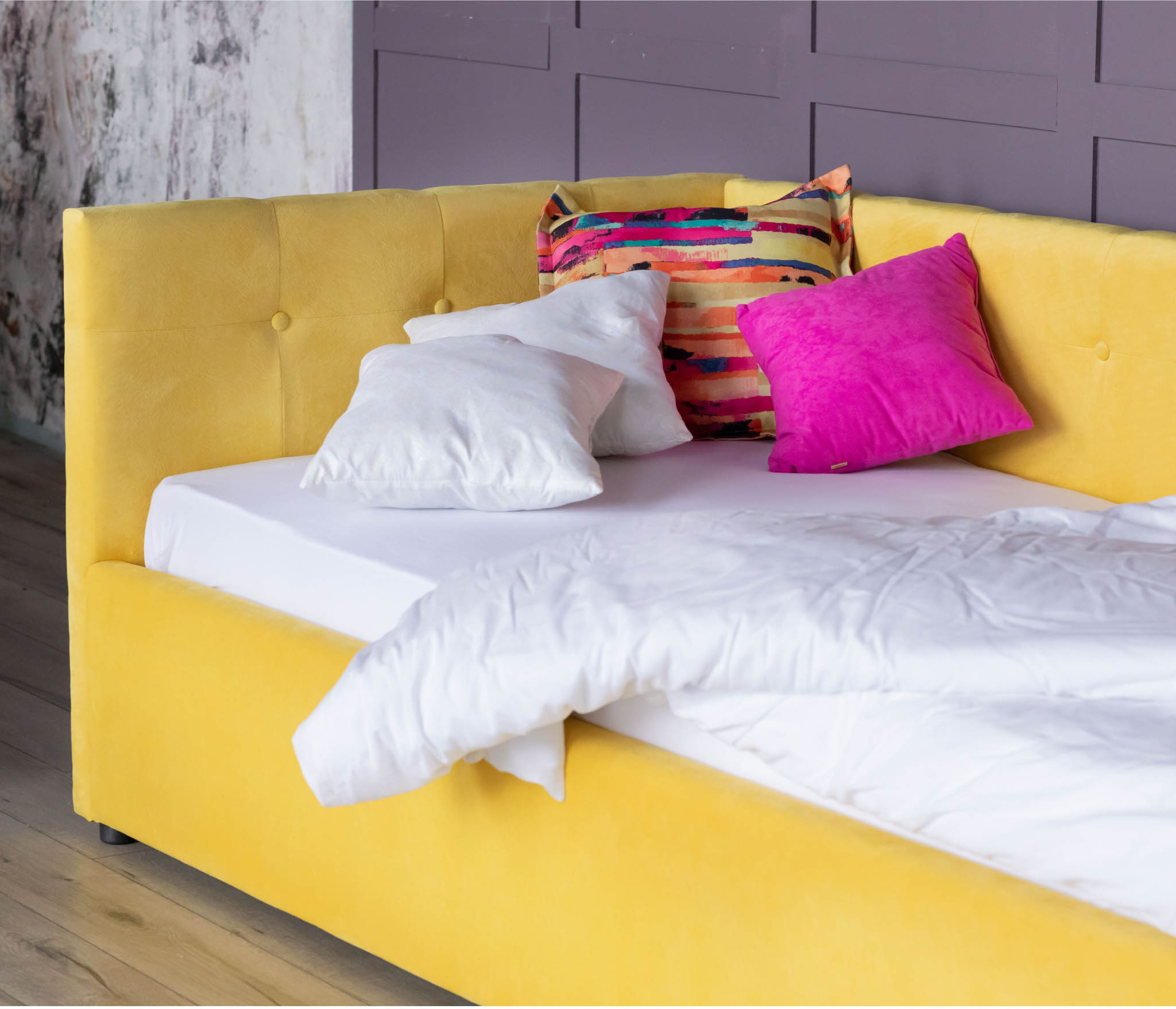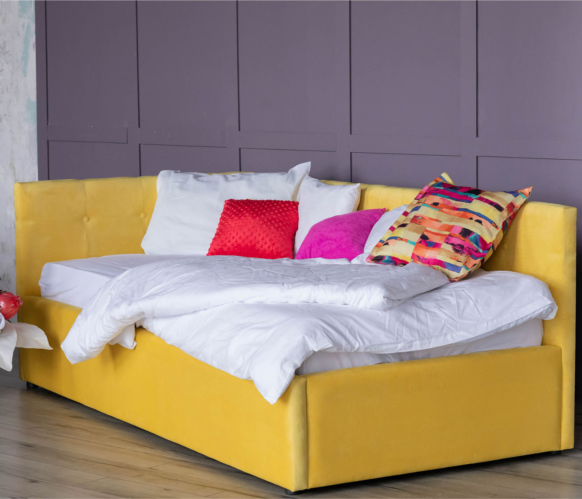 Мягкая угловая кровать BORNEO-Lemon с подъемным механизмом не только украсит интерьер вашей комнаты, но и создаст удобное решение для хранение домашних принадлежностей;