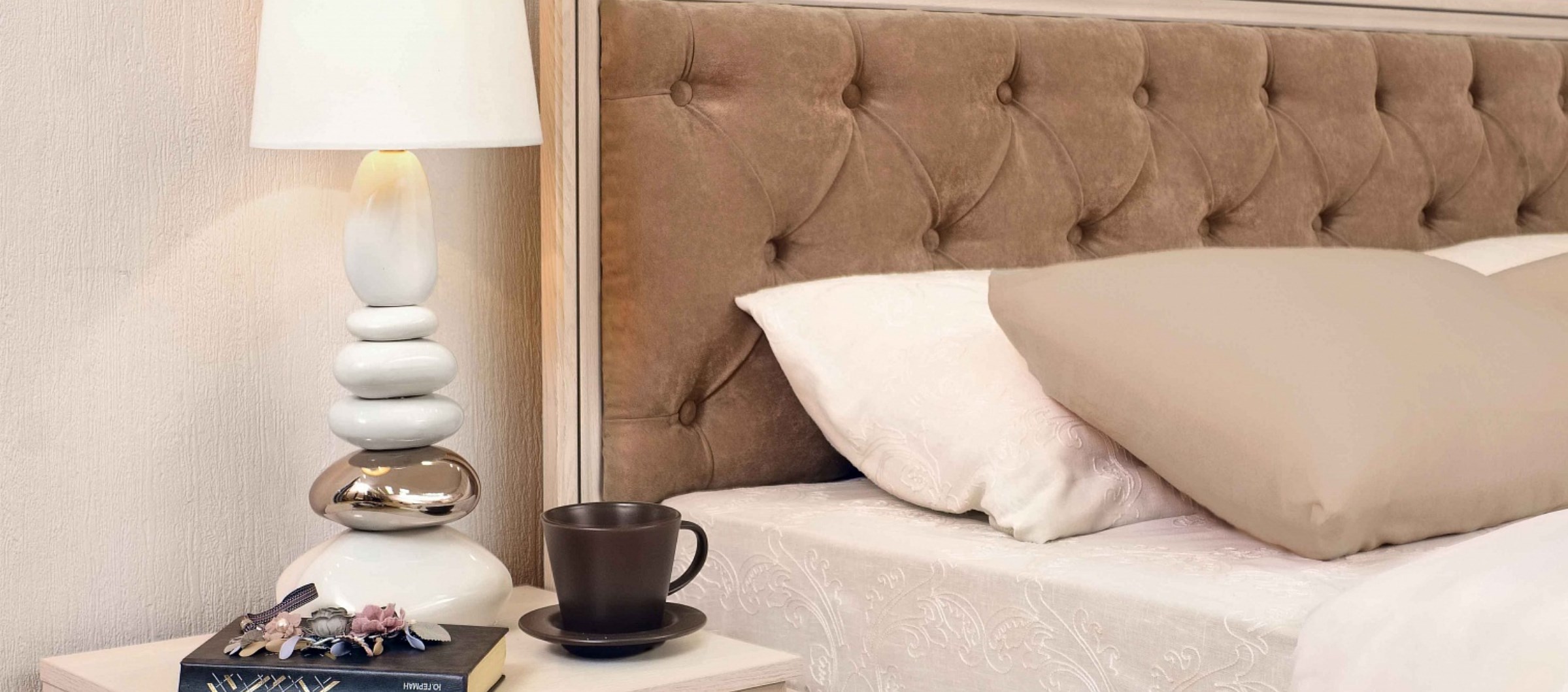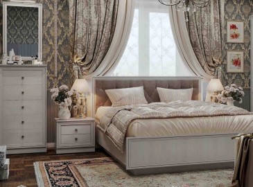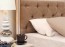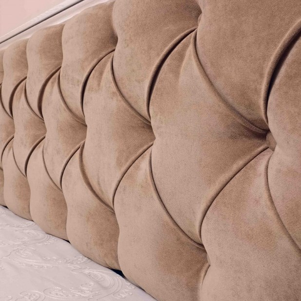 Мягкое изголовье из микрофибры с каретной стяжкой обрамлено рельефным профилем МДФ с патиной, что делает кровать роскошной и элегантной;