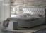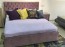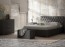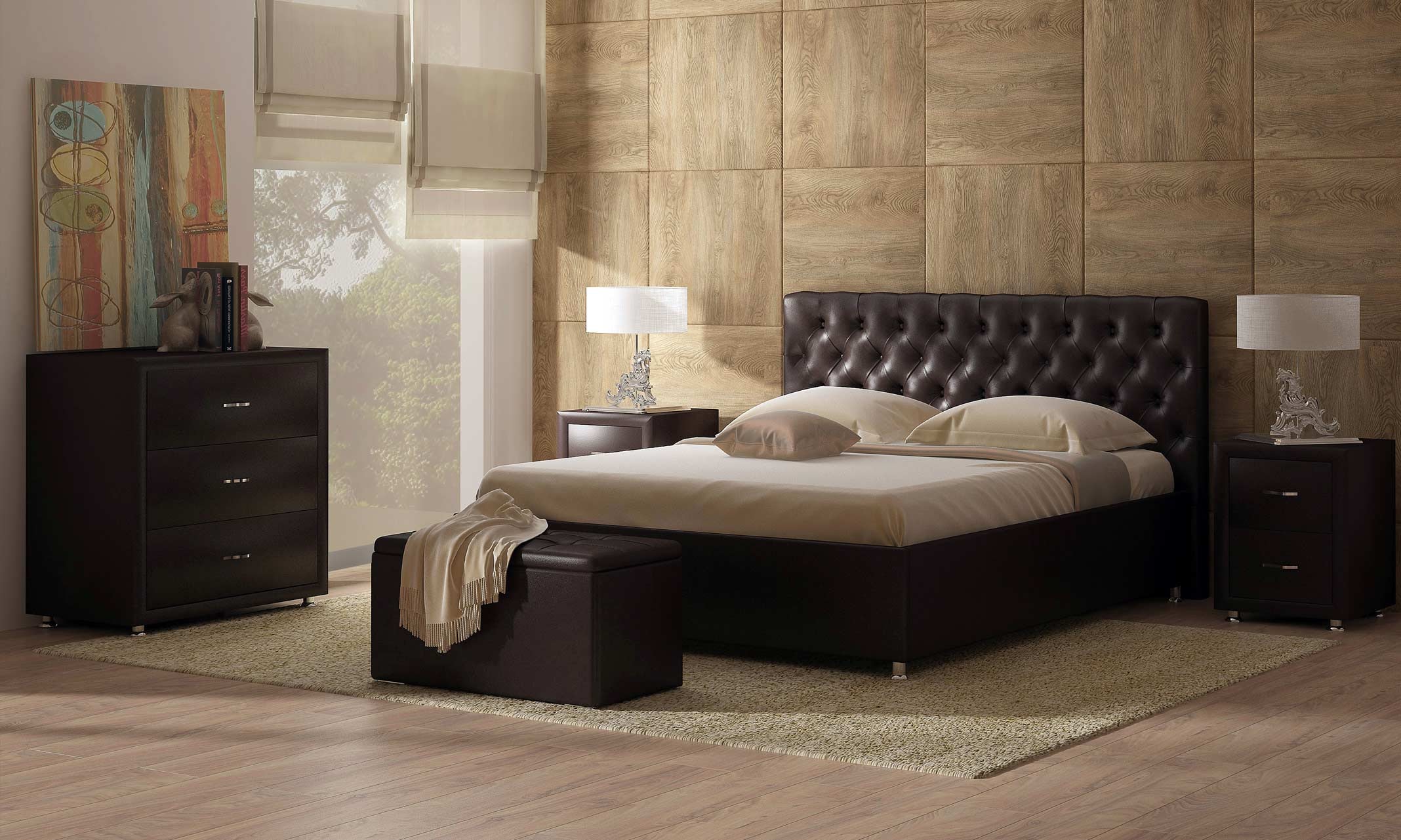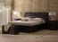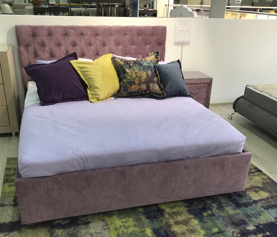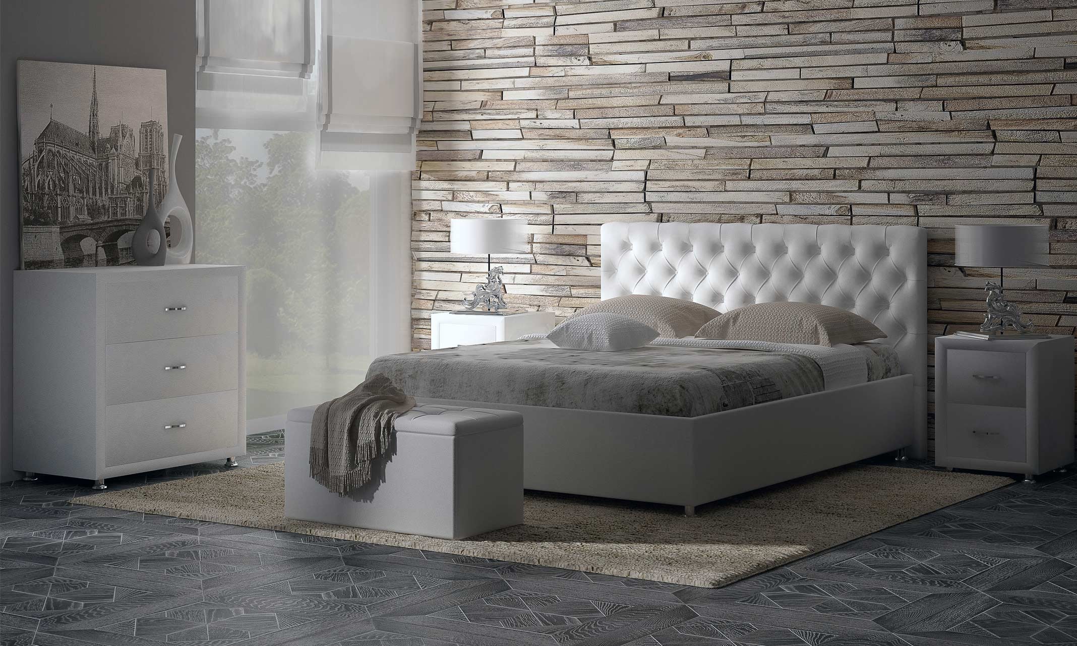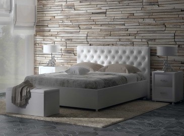 Элегантная интерьерная кровать с изголовьем, украшенным декоративными пуговицами и глубокой пиковкой. Обивка кровати имеет 12 вариантов цветового исполнения: из экокожи, глазго и велюра. Обратная сторона изголовья обита спандбондом, но, при желании, её можно выполнить из основного обивочного материала. Модель изготовлена из ДСП.