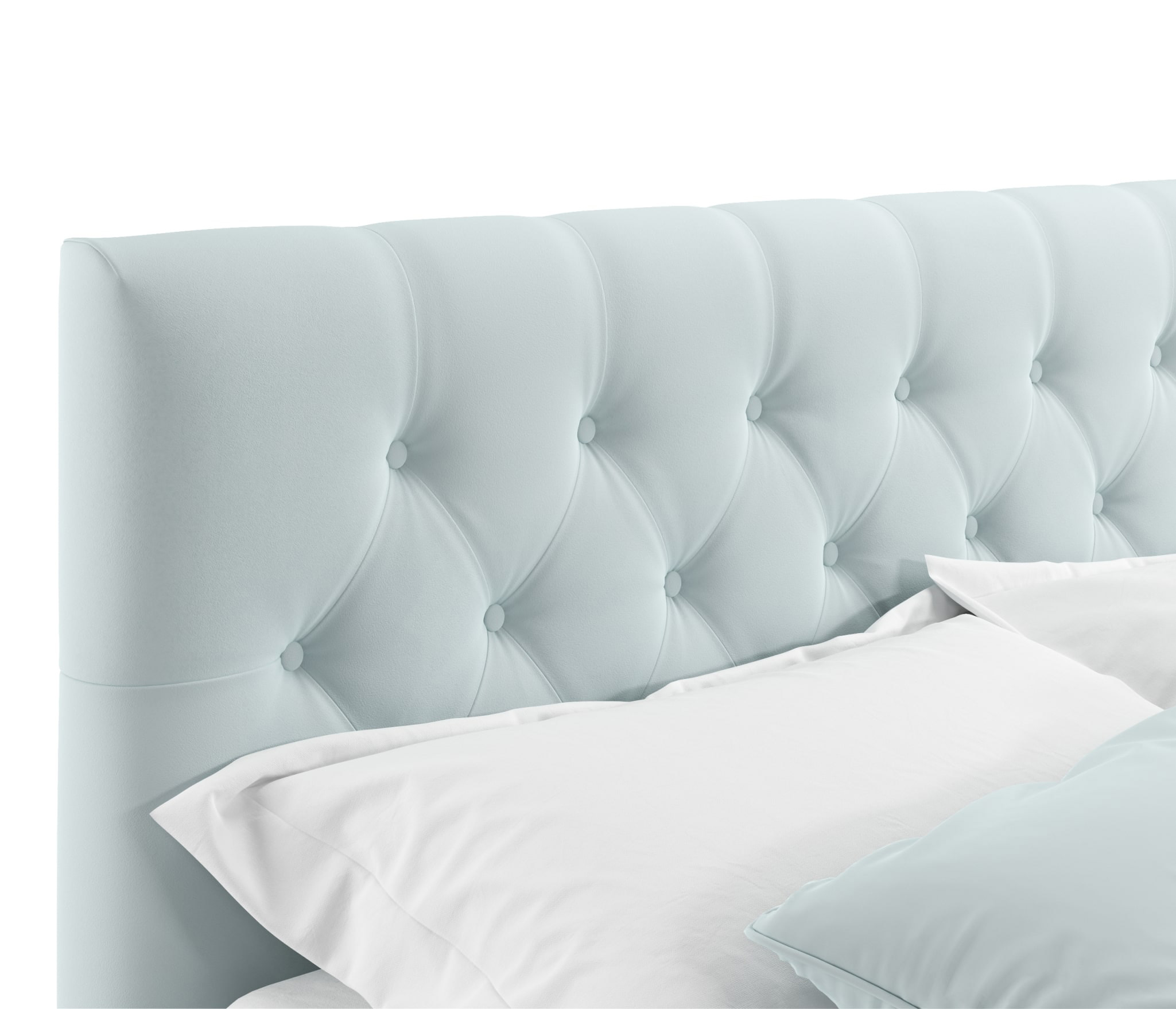 VICTORIA-MENTOL - Интерьерная мягкая кровать. Яркий акцент сделан на мягкую высокую рельефную спинку в стиле «Chester Laurence» с классической «каретной стяжкой», изготовленную вручную мастерами с 20-летним стажем. Каретная стяжка на сегодняшний день самый популярный способ обивки мягкой мебели. Мягкое изголовье с такой стяжкой более пухлое и объемное, а соответственно, более удобное не только для сна, но и для приятного времяпрепровождения (просмотра телепередачи, чтения книги, завтрака и даже, работы);