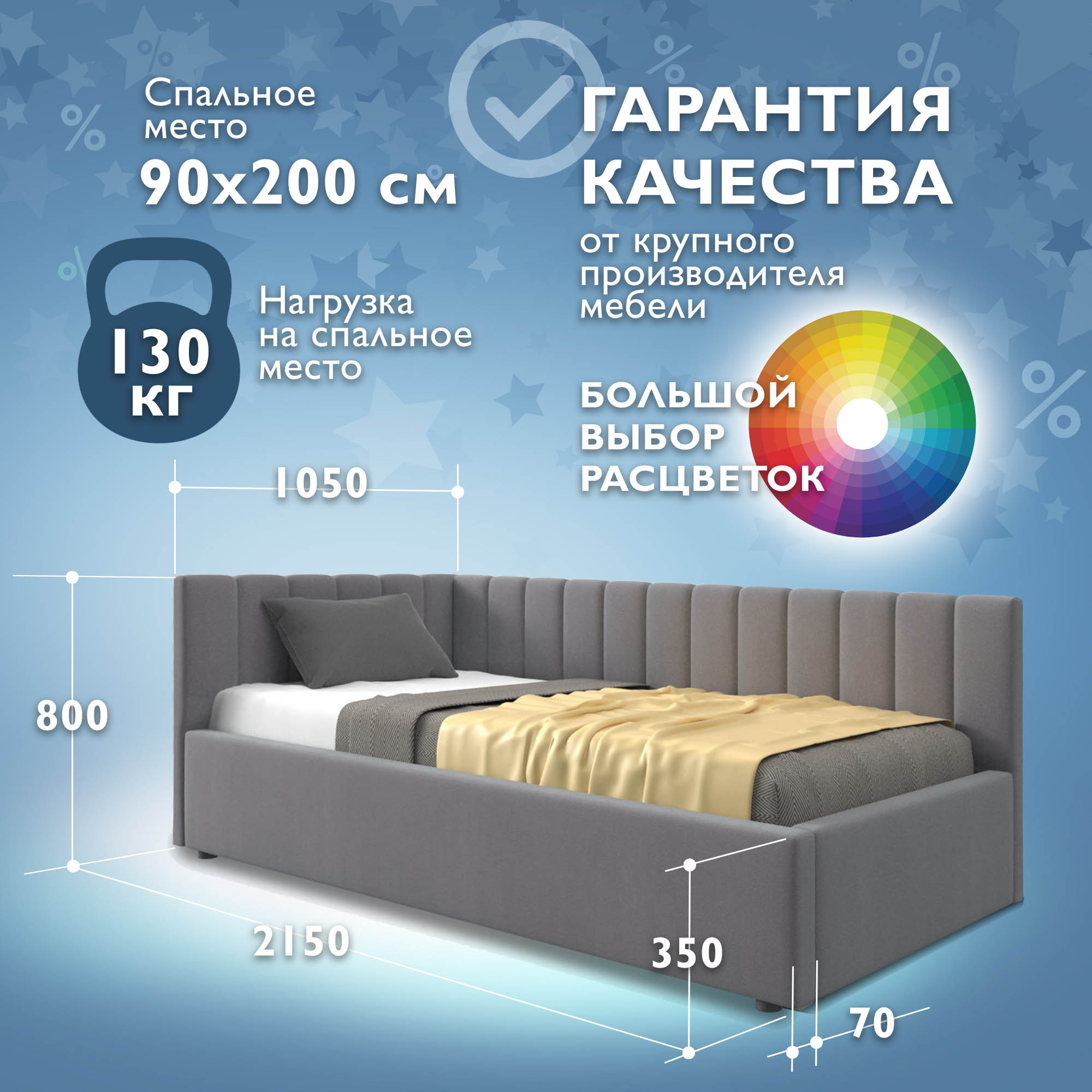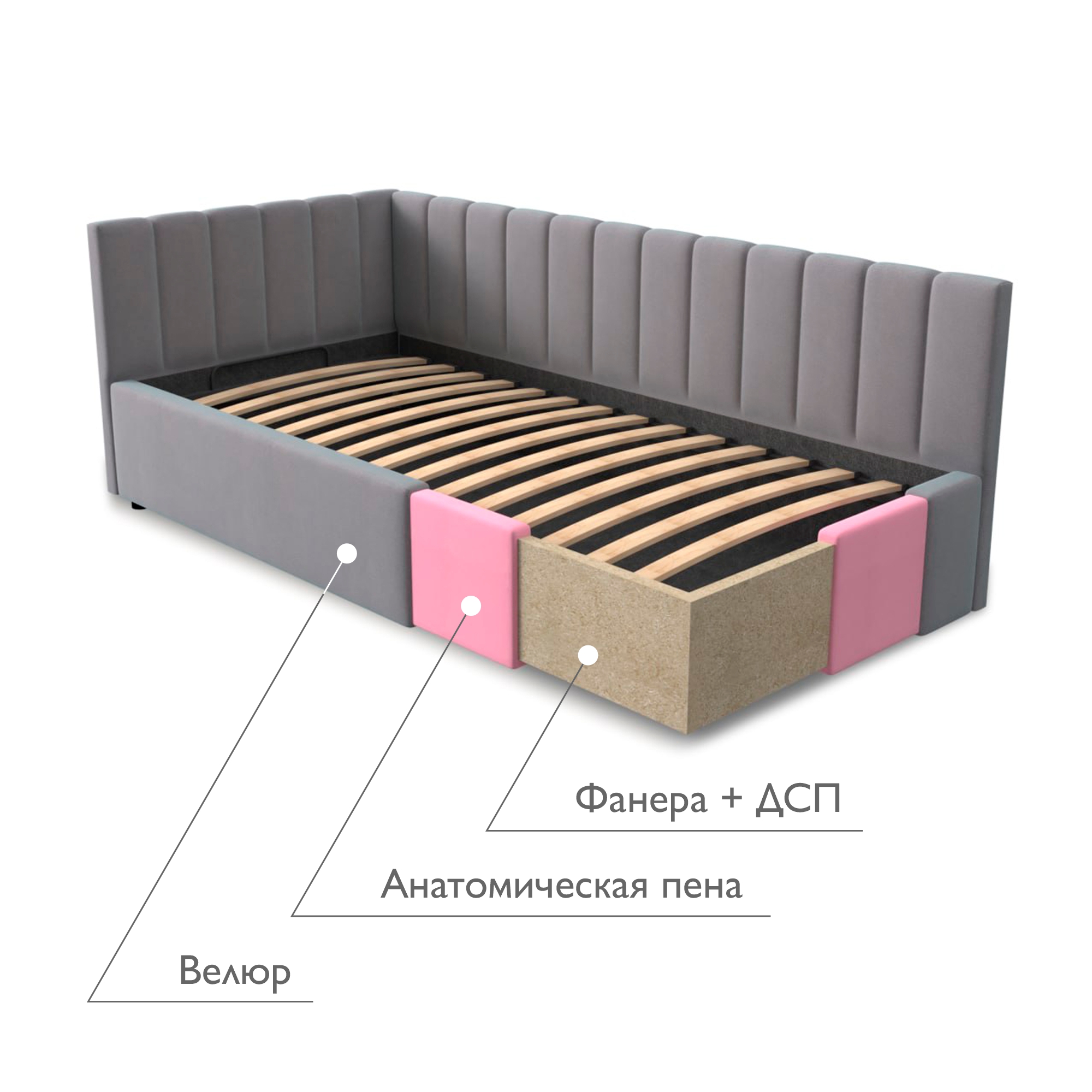 Представленная модель изготовлена из гиппоаллергенных материалов. Каркас выполнен с использованием ДСП и фанеры и покрыт анатомической пеной, что делает изделие прочным и безопасным при эксплуатации. Мягкие детали позволят избежать ссадин и синяков при эксплуатации кровати, что особенно актуально для детей и пожилых людей;