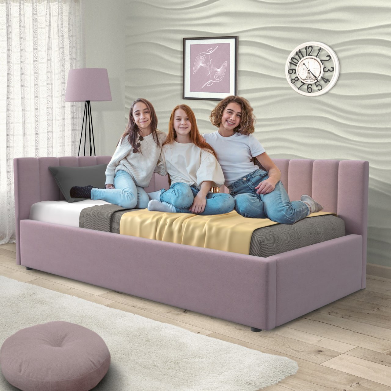 Представленная модель изготовлена из гиппоаллергенных материалов. Каркас выполнен с использованием ДСП и фанеры и покрыт анатомической пеной, что делает изделие прочным и безопасным при эксплуатации. Мягкие детали позволят избежать ссадин и синяков при эксплуатации кровати, что особенно актуально для детей и пожилых людей;
