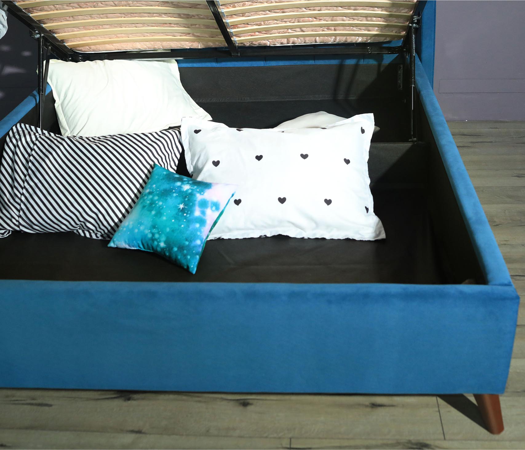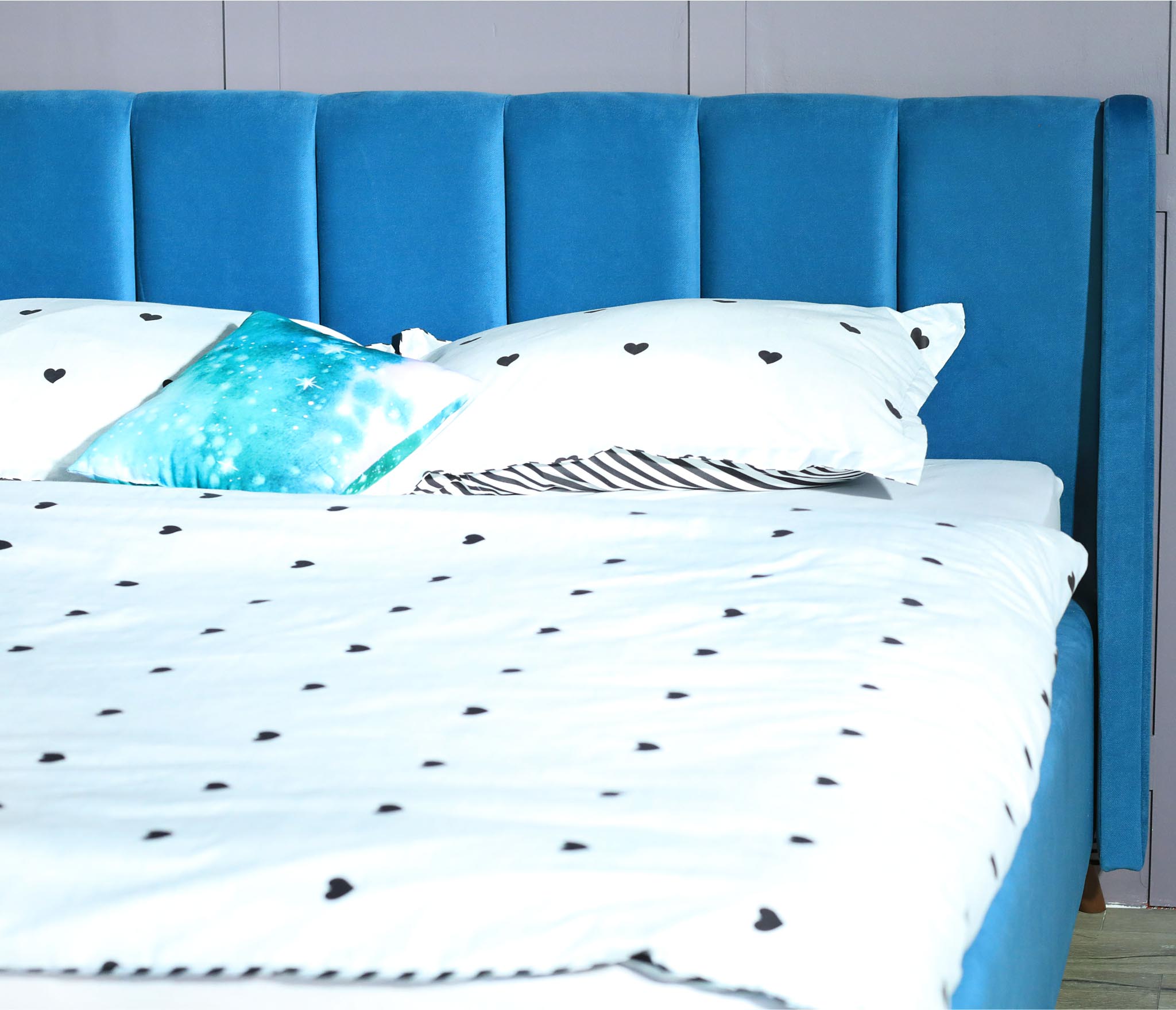 Стильная кровать LORENA-AQUA обладает привлекательным стилем и индивидуальностью. Оригинальность кровати придает изящные опоры, стилизованные под массив благородного дерева. Данная конструкция придает кровати легкость и невесомость. Также обращаем ваше внимание, что под такой кроватью удобно делать уборку.