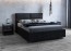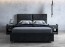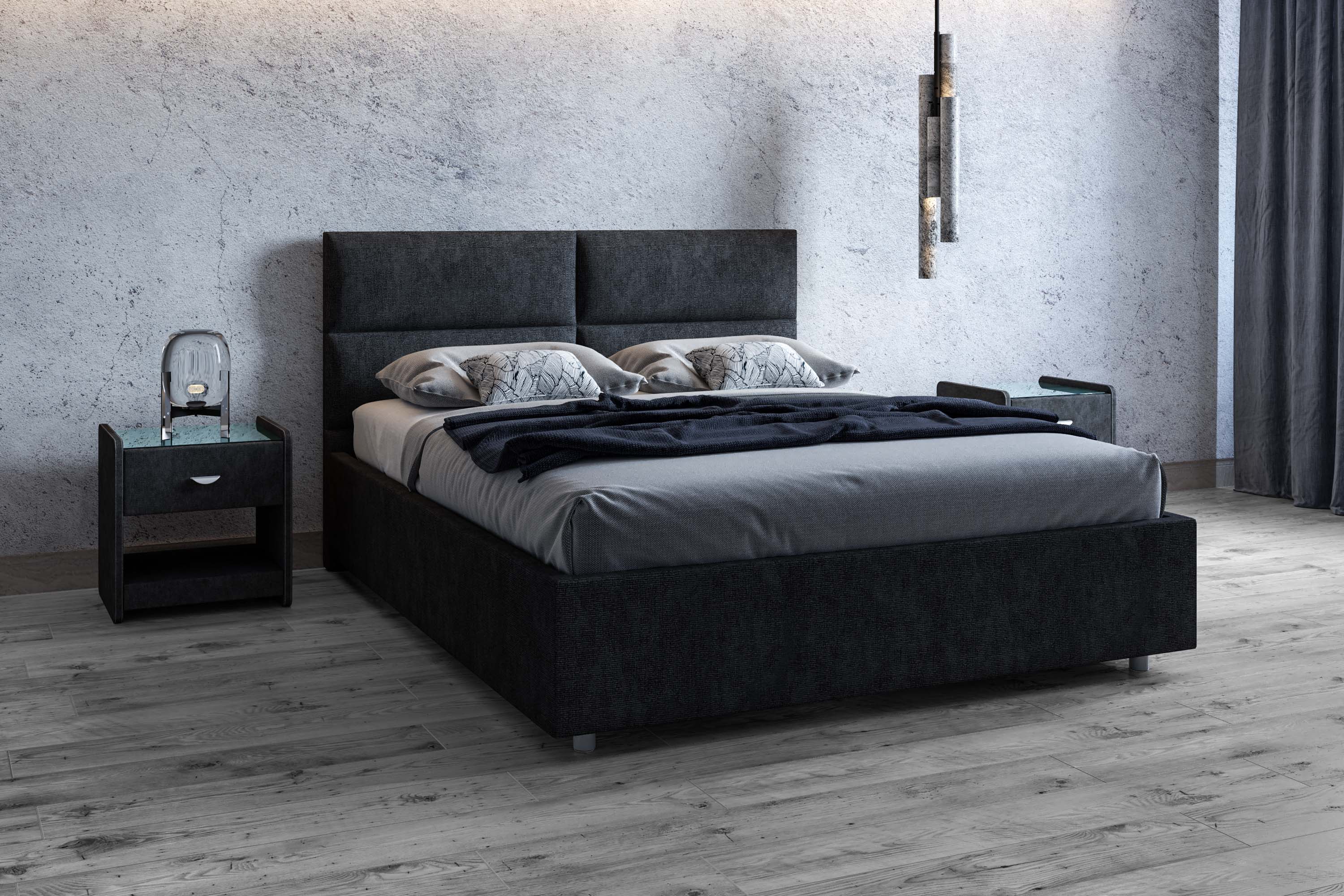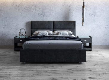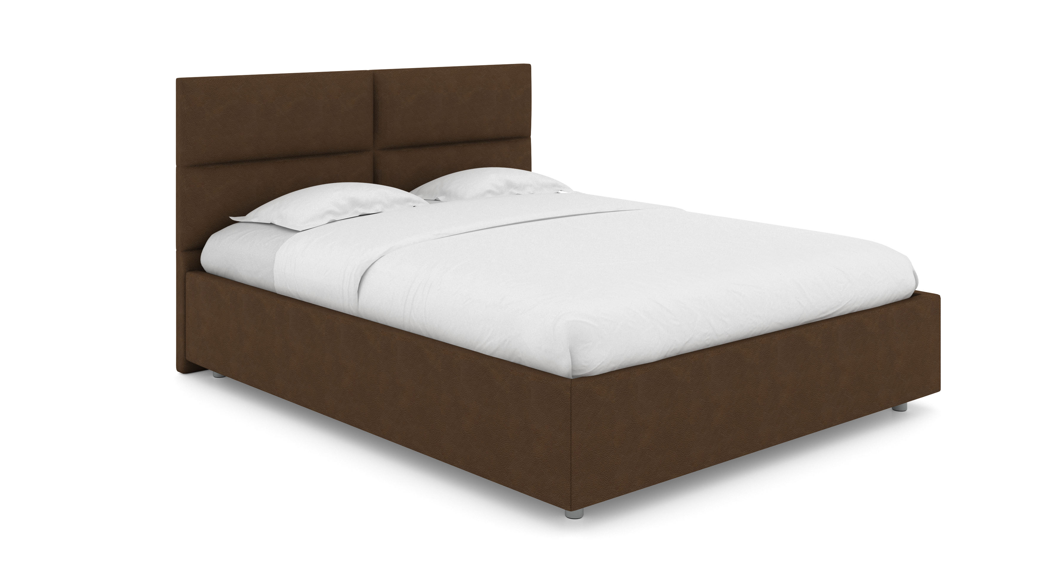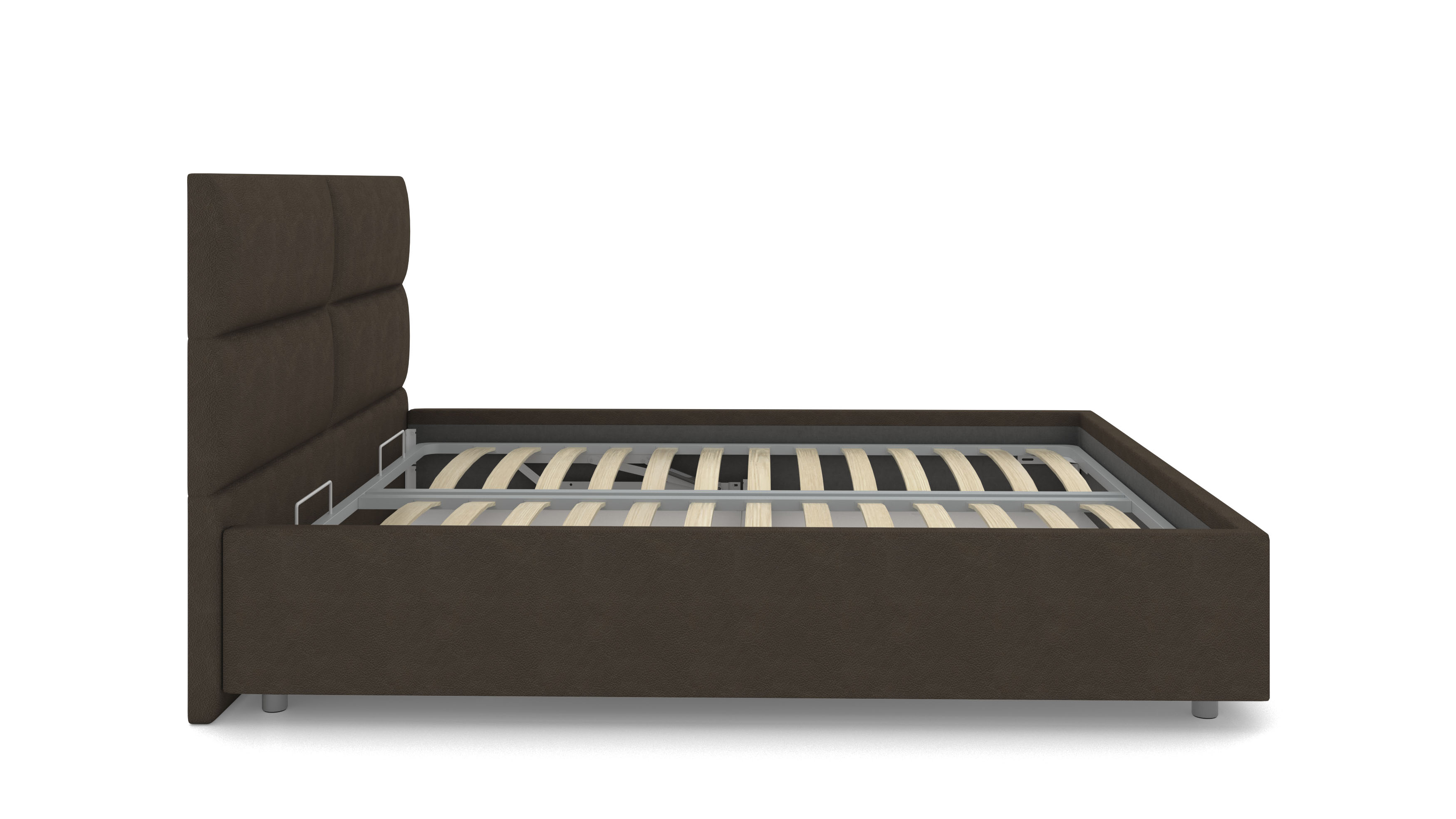 Лаконичная модель с изголовьем из объемных прямоугольников, сшитых между собой. Царги кровати выполняются по технологии съемного чехла. Модель изготовлена из ДСП. Обратная сторона изголовья обита спандбондом, но, при желании, её можно выполнить из основного обивочного материала. В комплект кровати входит кроватное основание и подъемный механизм с бельевым ящиком. Каркас основания выполнен из металла, ламели - из берёзы.