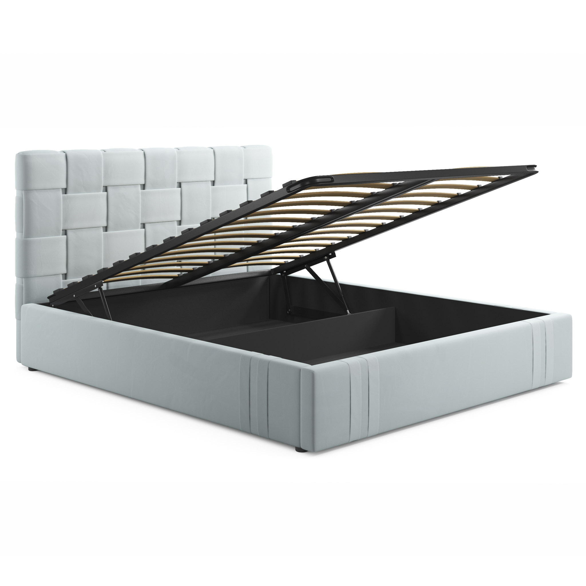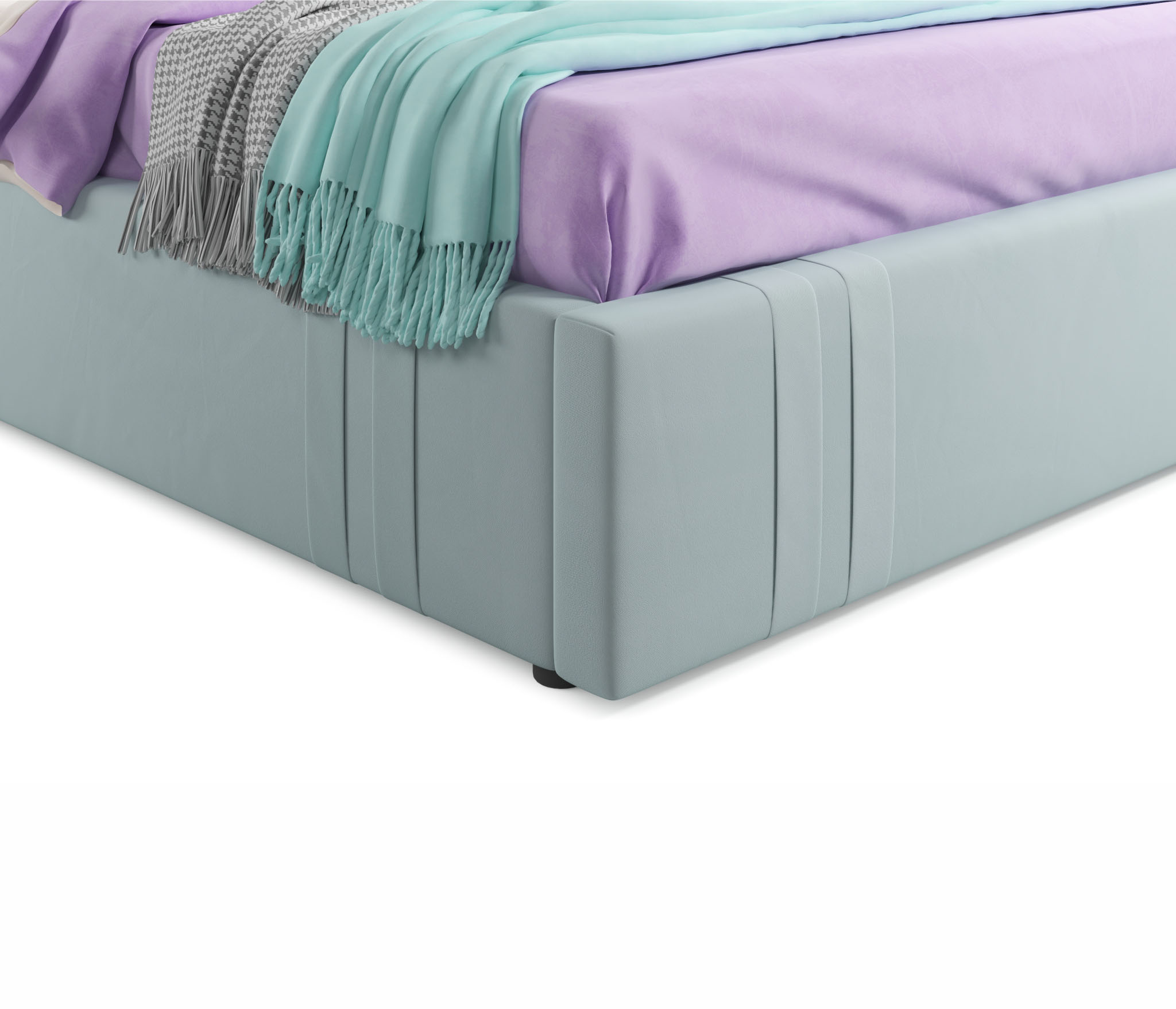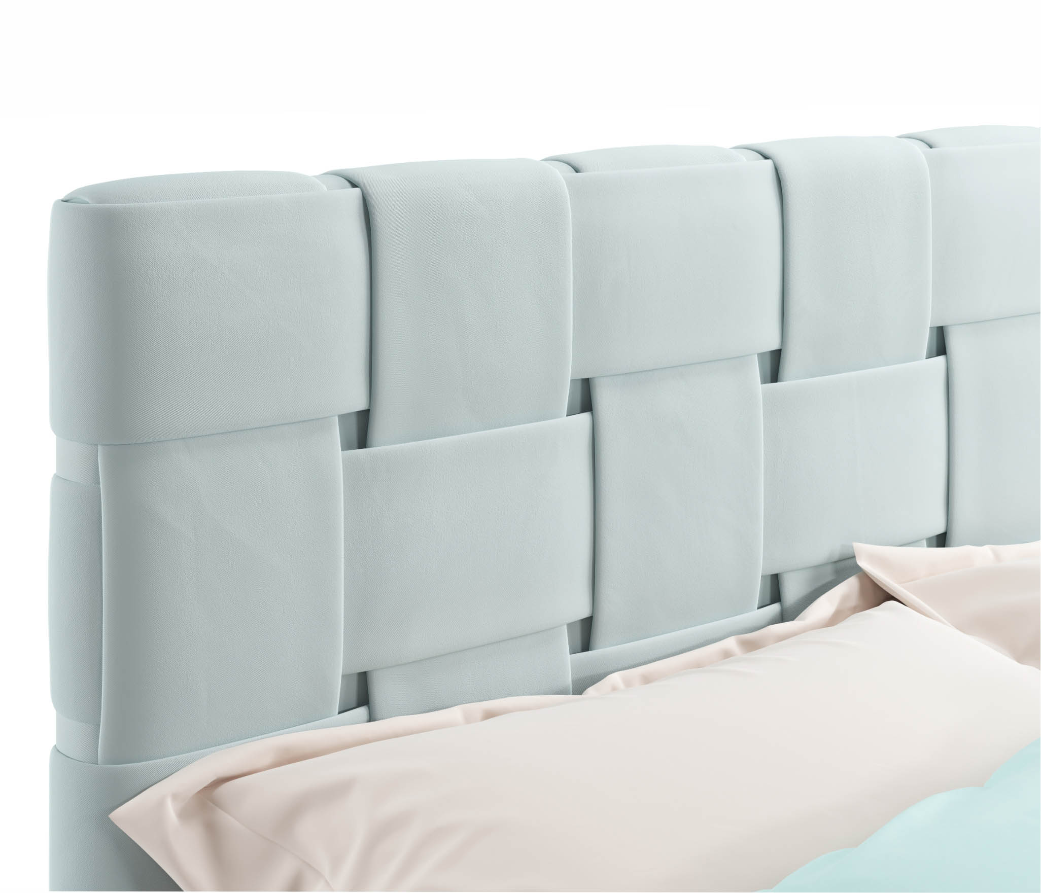 MELODIA-MENTOL - модное решение для вашей спальни. Яркий акцент 2-спальной кровати сделан на мягкое высокое изголовье, созданное вручную путем переплетения тканей;