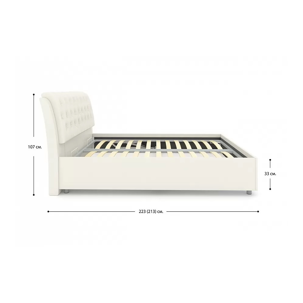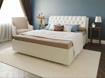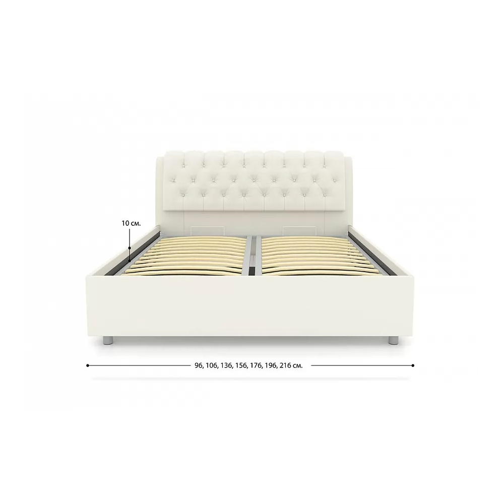 Элегантная интерьерная кровать с изголовьем, украшенным декоративными пуговицами и глубокой пиковкой. Модель изготовлена из ДСП. В комплект входит кроватное основание. Каркас основания выполнен из металла, ламели - из берёзы. При необходимости кровать Olivia может включить подъемный механизм с бельевым ящиком.