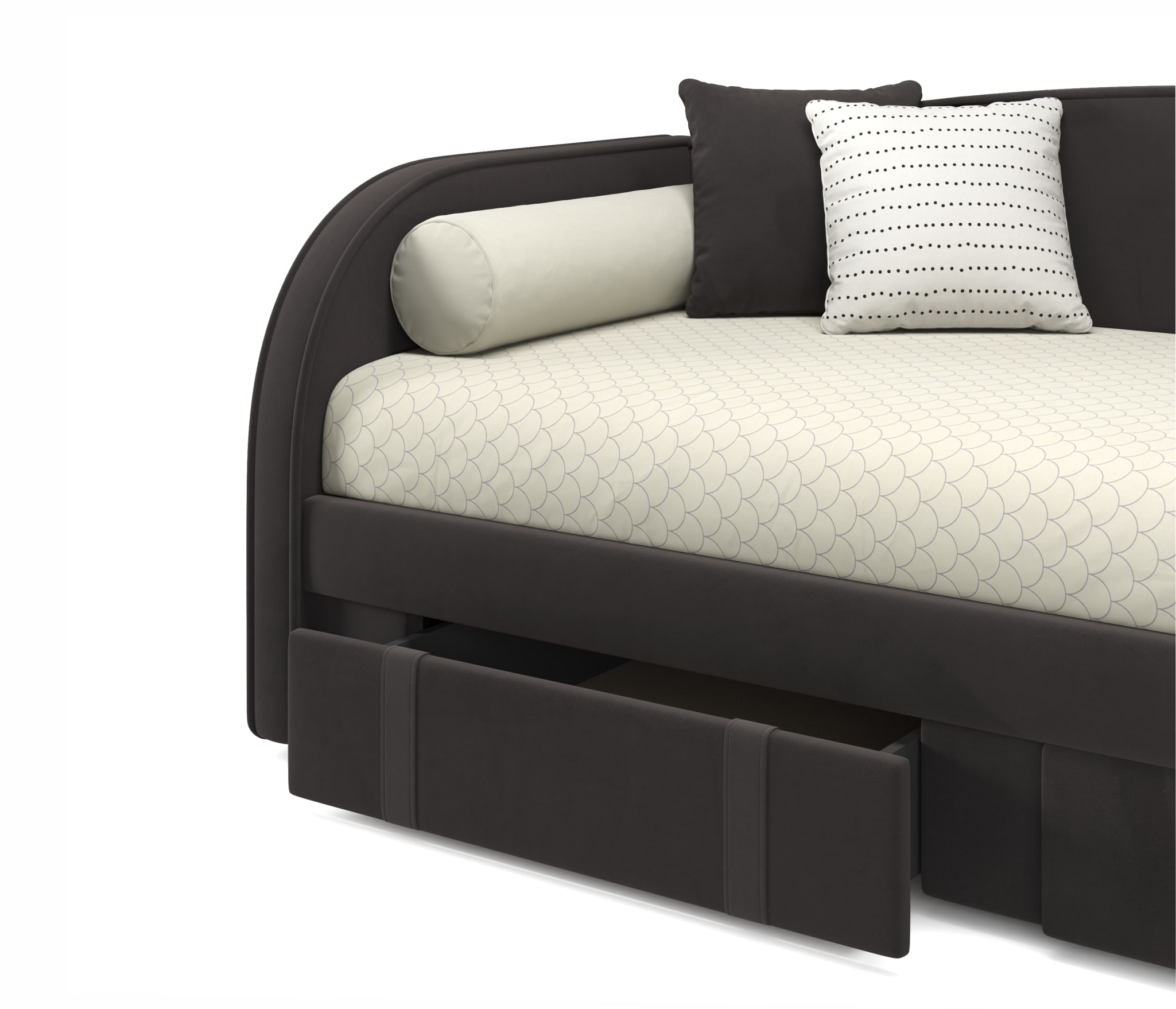 Диван оснащен двумя выдвижными ящиками на роликовых опорах. Фасады ящиков декорированы вертикальными полосками-ручками из ткани, служащими для выдвижения ящиков. Такой интересный дизайнерский прием без применения дополнительной фурнитуры позволяет сохранить стилистическую целостность кровати;