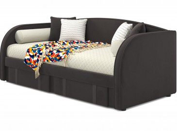 ALBA-CHOKOLATE - уникальный предмет мебели, который совмещает в себе полноценную кровать и диван. Высокое заднее изголовье в форме дуги придает кровати изысканный вид. Все мягкие спинки декорированы рельефным кантом из ткани в тон кровати;