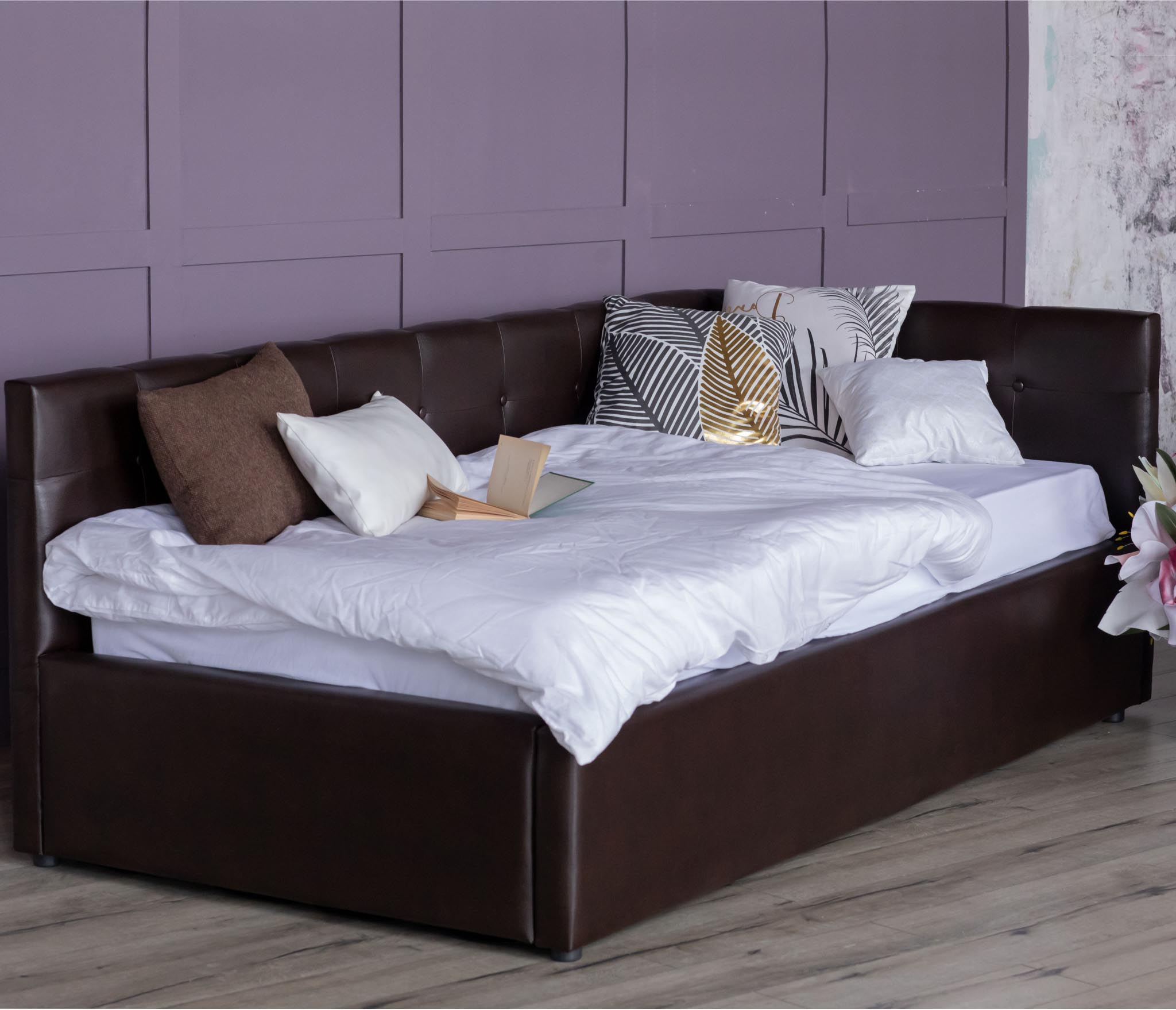 Корпус кровати выполнен из древесной плиты и покрыт специальной мебельной пеной с анатомическим эффектом. Что делает изделие безопасным и позволяет избегать царапин и синяков;