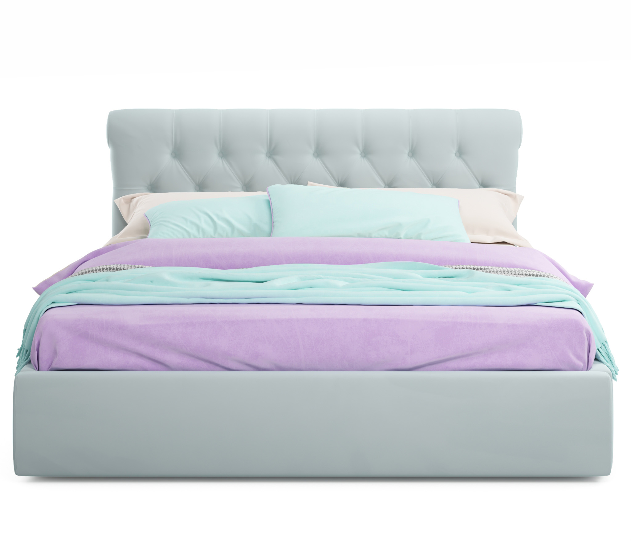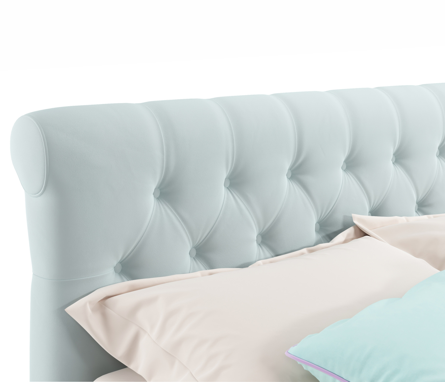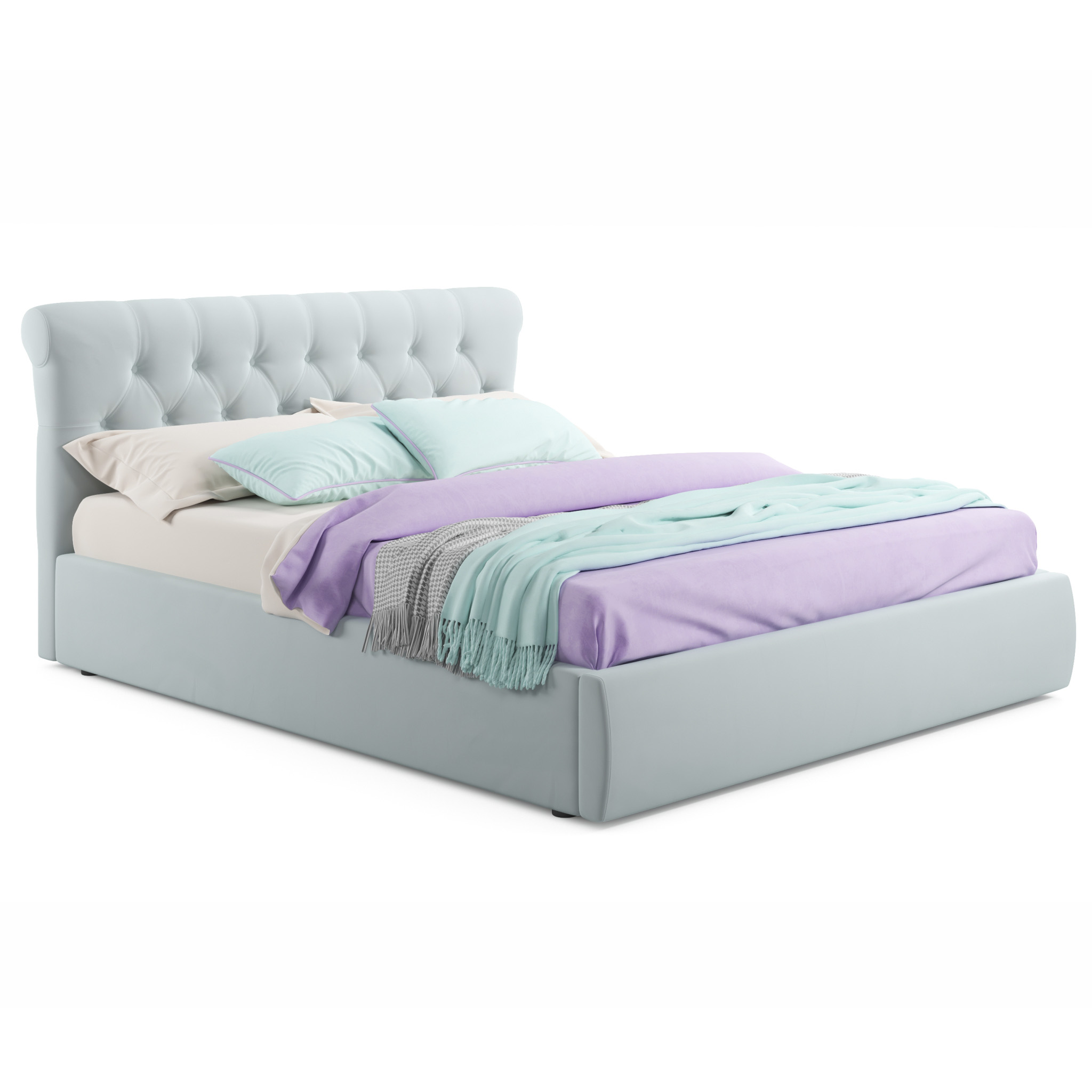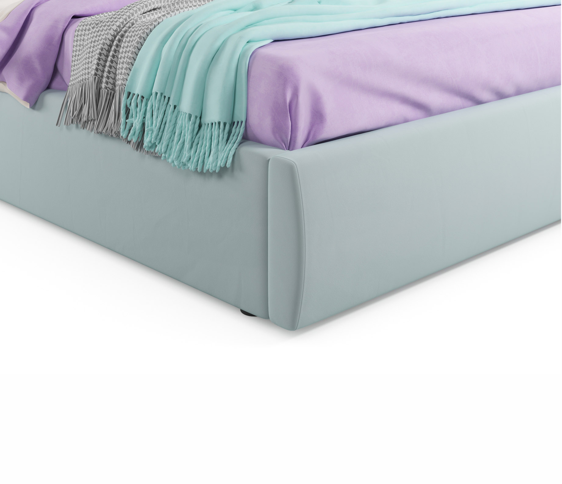 VERSAL-MENTOL - роскошное решение для вашей спальни. Яркий акцент 2-спальной кровати сделан на мягкое высокое изголовье, созданное вручную путем переплетения тканей;