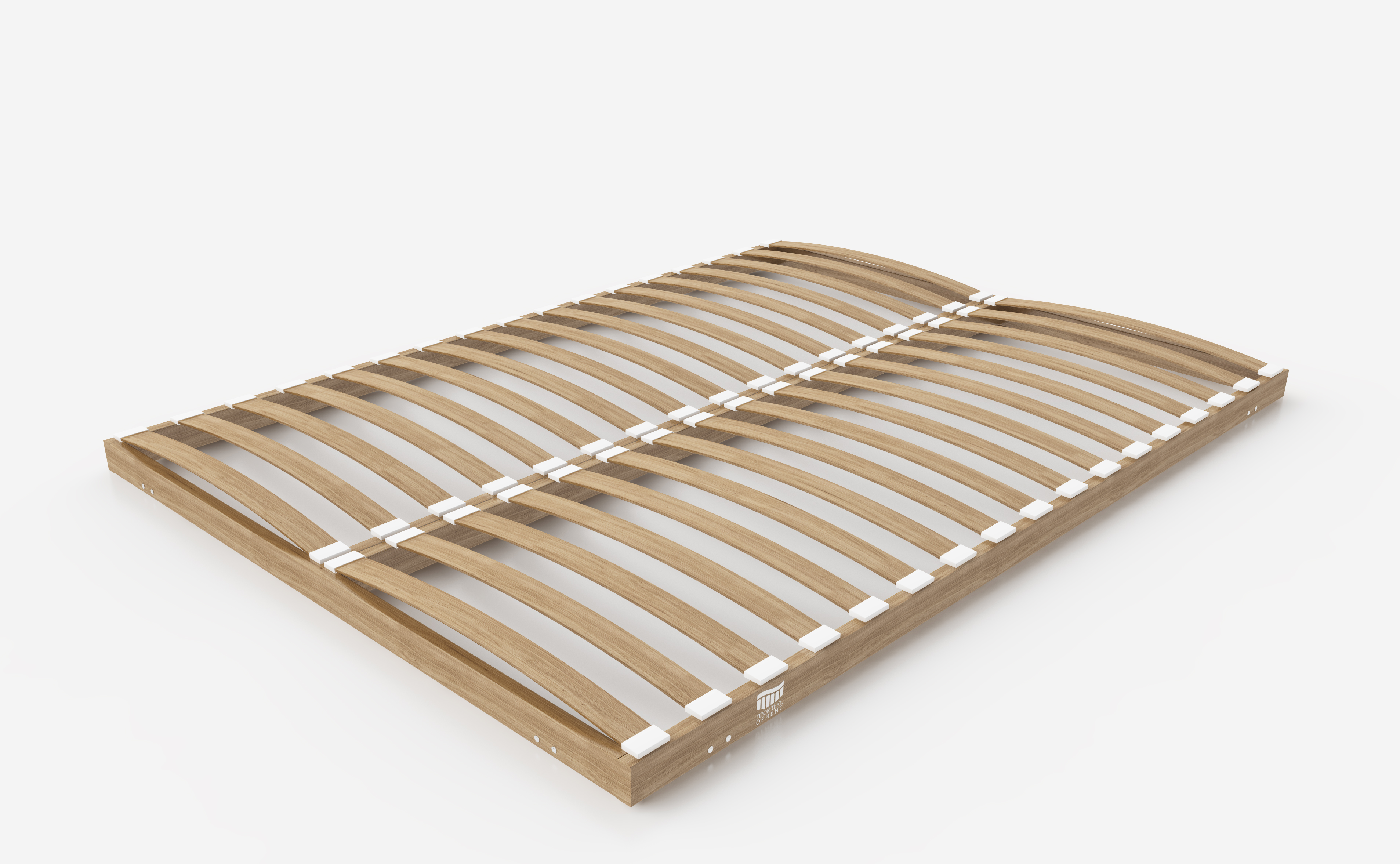 Каркас основания изготовлен из высококачественного березового шпона. Ширина бруса – 50 мм, высота – 25 мм. На каркасе расположены пластиковые латодержатели на одинаковом расстоянии друг от друга, чтобы воздух мог циркулировать в матрасе. В них вставляются 16 прочных латов из берёзовой фанеры (8Х53 мм). Они имеют специальную изогнутую форму, помогающую мягко амортизировать под воздействием нагрузки в пределах 120 кг на спальное место.