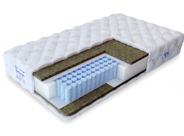 С двух сторон проложен бикокос. Жесткий от природы материал придает спальному месту упругость и усиливает ортопедичность блока независимых пружин. Его пористая структура дает возможность воздуху свободно циркулировать внутри конструкции. Наполнитель не вызывает аллергию и не боится перепадов температур.