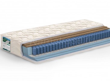 Чехол несъемный из двойного жаккарда; Кокосовое волокно - 10 мм; Кокосовое волокно - 10 мм; S-500 Независимый пружинный блок - 140 мм. Термополотно - 3 мм; Высокоэластичная экопена - 20 мм; Чехол несъемный из двойного жаккарда (белого цвета) Короб из матропены по периметру матраса;