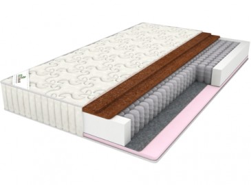 Чехол несъемный из двойного жаккарда; Кокосовое волокно - 10 мм; Кокосовое волокно - 10 мм; S-500 Независимый пружинный блок - 140 мм. Термополотно - 3 мм; Высокоэластичная экопена - 20 мм; Чехол несъемный из двойного жаккарда (белого цвета) Короб из матропены по периметру матраса;
