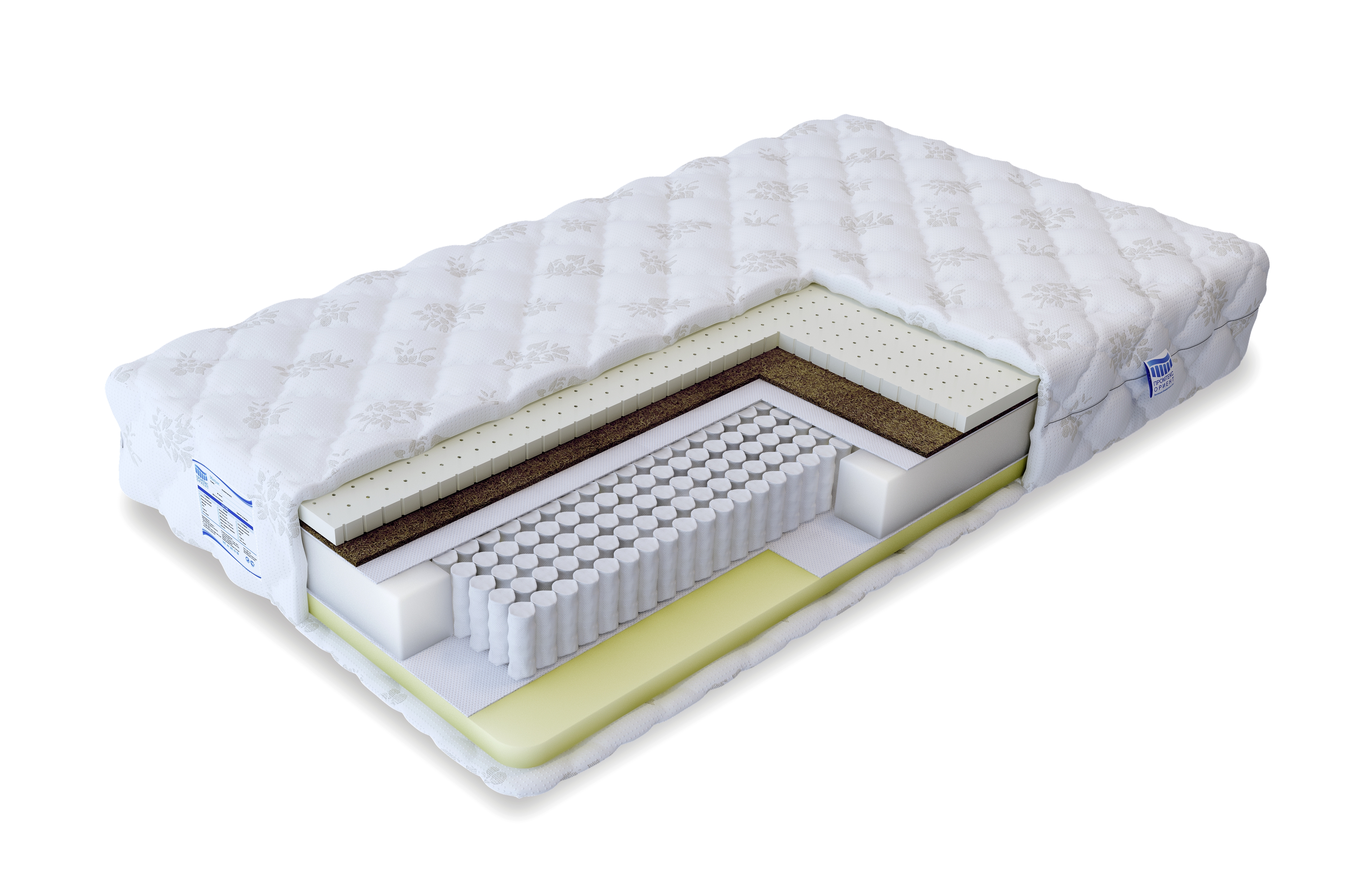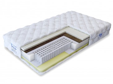 Основой матраса служит блок пружин из серии «Мультипакет»: это когда каждая пружина имеет свой собственный чехол и сгибается под давлением тела независимо от остальных. В этом случае позвоночник и мышцы спины полностью расслабляются. Одна сторона матраса имеет настил из вязко-эластичной пены (мемори), умеющей запоминать формы вашего тела под воздействием тепла и дарить ощущения воздушности и упругой мягкости. Вторая сторона – средней степени жёсткости из-за использования комбинации из кокоса и латекса. Обивка ортопедического матраса выполнена из отлично вентилируемого трикотажа, стеганного на синтепоне.