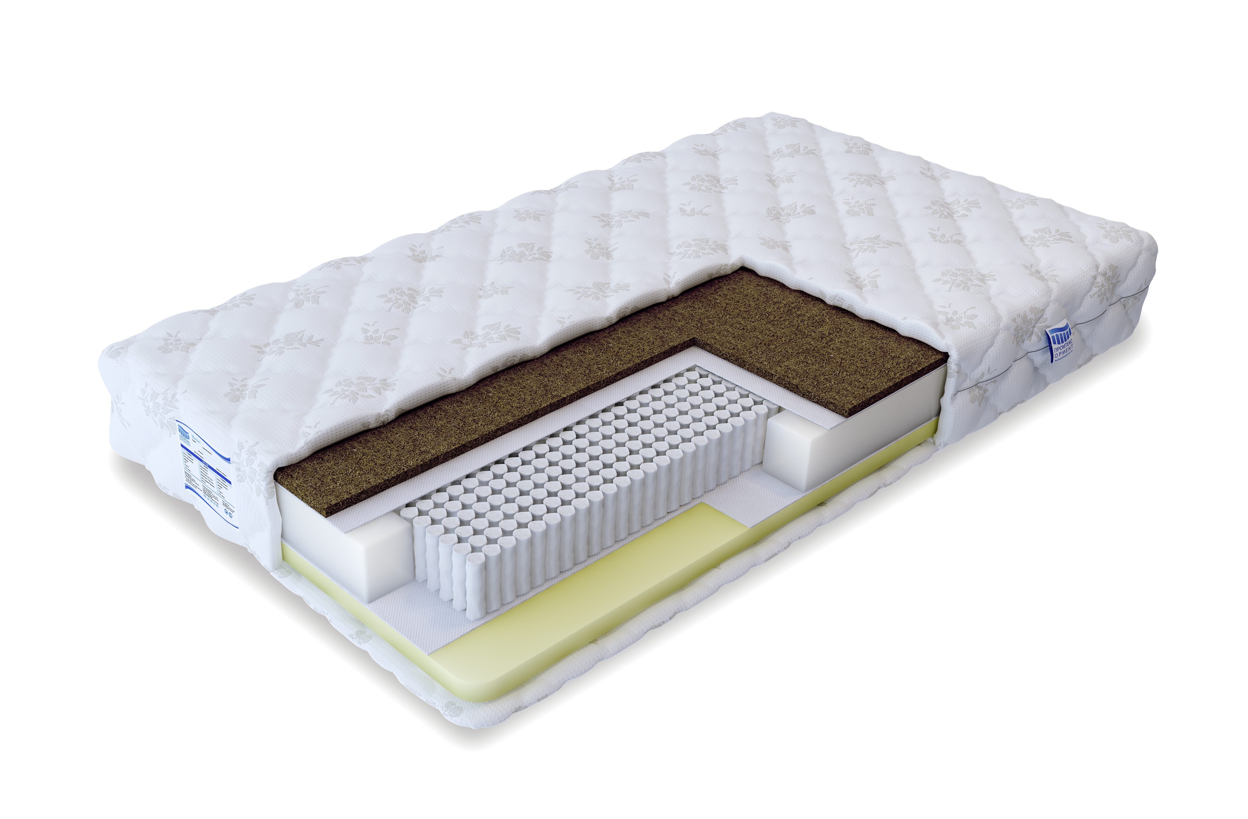Между мемориформом и кокосом находится блок независимых пружин усиленной конструкции, обеспечивающий стабильный ортопедический эффект с точечной поддержкой тела в анатомическом положении. Пружины работают бесшумно, поскольку находятся в отдельных пакетах из спанбонда. Все слои матраса хорошо просматриваются через смотровую молнию съёмного чехла из трикотажа. Простёганный на синтепоне, он придаёт обеим сторонам изделия упругий рельеф и приятную мягкость.