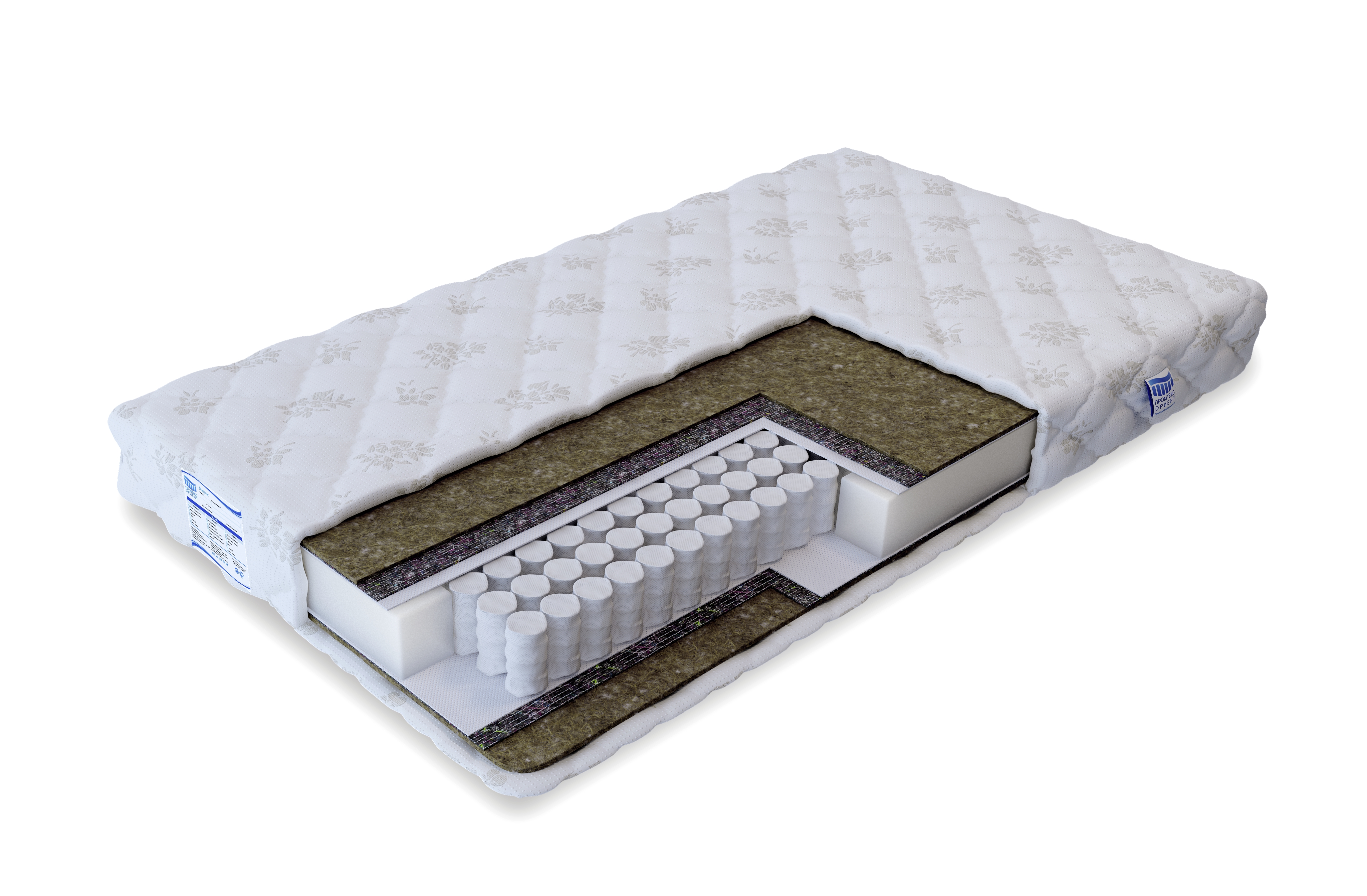 Пружинный блок с торцов укреплён экопеной, сверху и снизу проложен спанбондом для защиты бикокоса от износа. Все слои матраса спрятаны в трикотажный чехол.