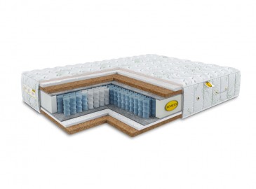 Пружины данного блока расположены в шахматном порядке относительно друг друга. Такое расположение пружин придает лучшие ортопедические свойства, повышает срок службы и допустимую нагрузку. В матрасе применяются натуральные наполнители латекс и латексированная кокосовая койра. Матрас является двусторонним, одна сторона средней жесткости, другая немного более жесткая, это позволит выбрать удобную для себя сторону. Матрас снабжен четырьмя ручками для удобства переворачивания, а также аэраторами для дополнительной вентиляции слоев.
