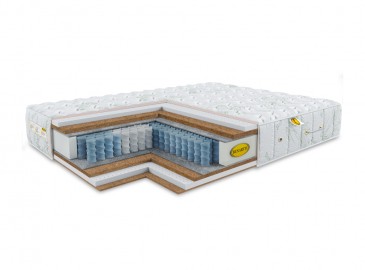 Пружины данного блока расположены в шахматном порядке относительно друг друга. Такое расположение пружин придает лучшие ортопедические свойства, повышает срок службы и допустимую нагрузку. В матрасе применяются натуральные наполнители латекс и латексированная кокосовая койра. Матрас является двусторонним, одна сторона средней жесткости, другая немного более жесткая, это позволит выбрать удобную для себя сторону. Матрас снабжен четырьмя ручками для удобства переворачивания, а также аэраторами для дополнительной вентиляции слоев.