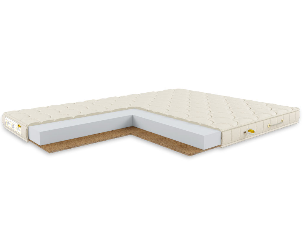 Матрас является беспружинным, основой служит экологически чистый материал средней жесткости искусственный латекс высотой 9 см. С одной стороны добавлен слой латексированной кокосовой койры толщиной 1 см, придающий дополнительную жесткость и долговечность матрасу. Чехол матраса, выполнен из хлопкового жаккарда, простеганного на экологически чистом материале Hollcon.
