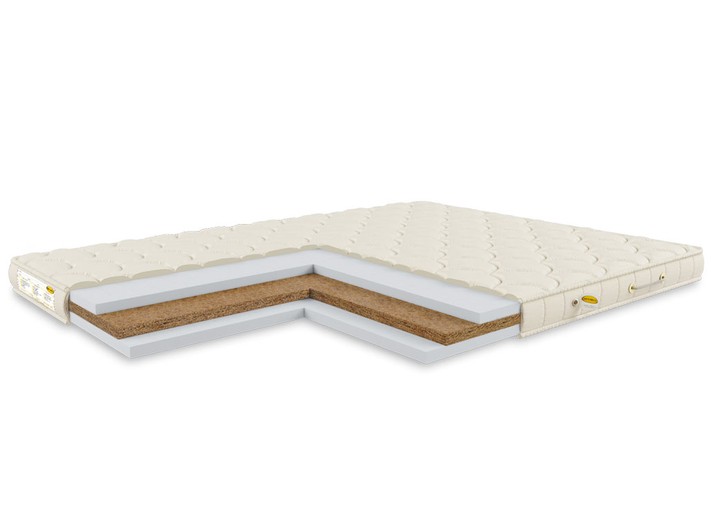 Матрас является беспружинным, основой служит чередование слоев экологически чистого материала средней жесткости искусственный латекс высотой 3 см и латексированной кокосовой койры толщиной 3 см, придающий дополнительную жесткость и долговечность матрасу.