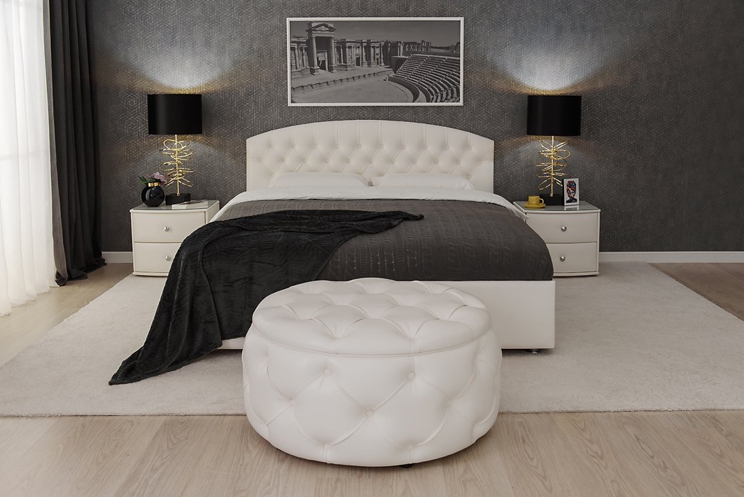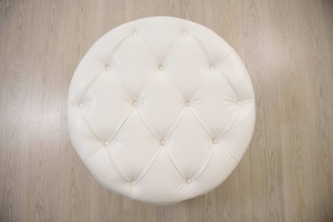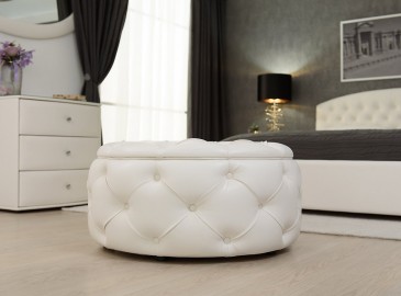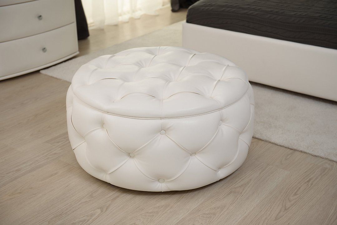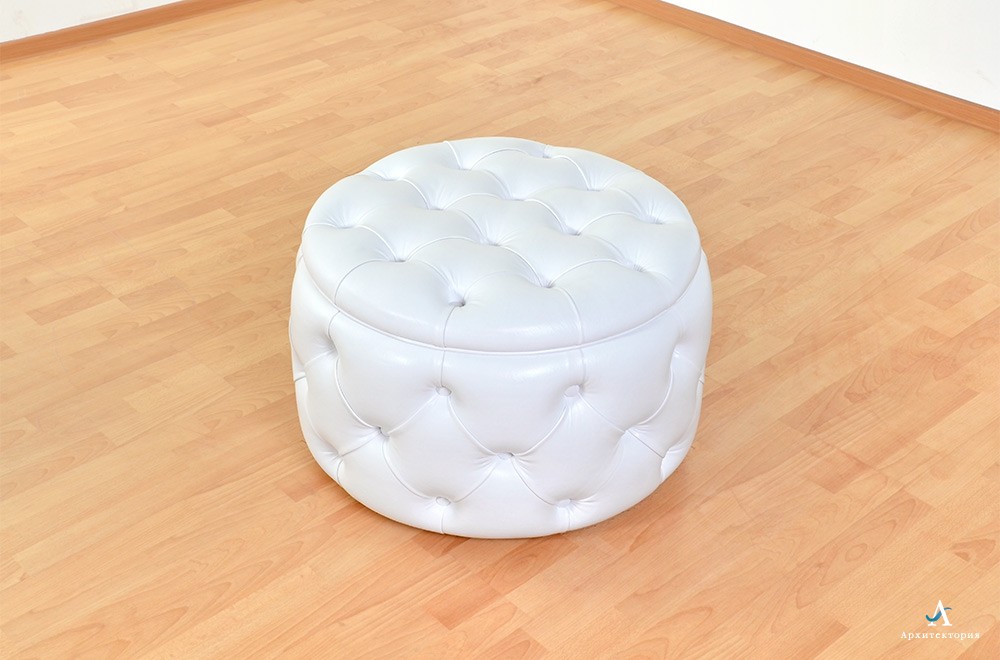 РОНДЕЛЬ - круглый пуф выполнен в стиле барокко. Его можно исполнить как из экокожи, так и из ткани. Крышка у пуфа несъемная. Каретные утяжки можно украсить как пуговицами, так и стразами;