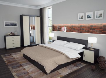 Современный спальный гарнитур "Новита". Изготовлен из ЛДСП 16мм. Корпуса предметов выполнены из темной текстуры Венге. Фасады исполнены из светлой текстуры Дуб Белфорд.