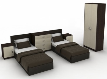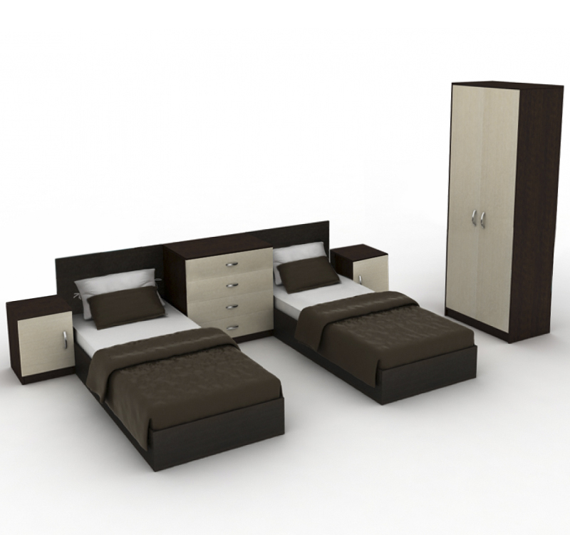 Современный спальный гарнитур "Promo". Изготовлен из ЛДСП 16мм. Корпуса предметов выполнены из темной текстуры Венге. Фасады исполнены из светлой текстуры Дуб Белфорд.